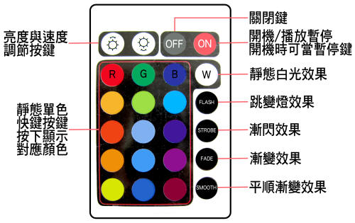2.單色顏色亮度可調,通過搖控器可選擇固定顏色對應的三種亮度,默認為中等亮度。